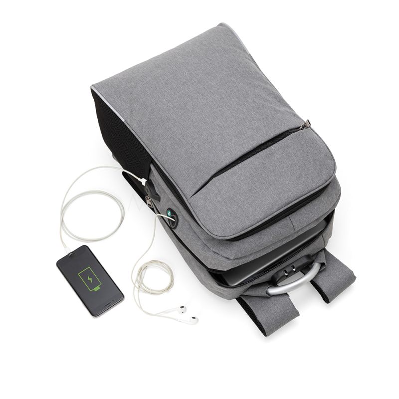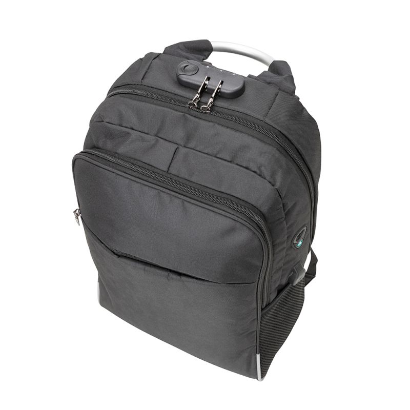 Mochila para notebook personalizada produzida em poliéster. Possui compartimento interno para notebook de 14.5 Polegadas, cursores de metal, fechamento por cadeado com senha, alça de mão em metal, alça de ombro acolchoada, 2 bolsos frontais, 2 bolsos laterais, mini bolso na alça de ombro, conector USB na lateral e saída para fones de ouvido na lateral. Ideal para brindes promocionais e eventos corporativos.