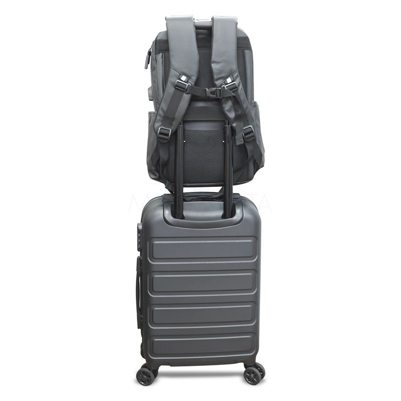 Mochila para notebook personalizada confeccionada em material sintético com compartimento para notebook até 15,6 polegadas. Contém um compartimento grande com divisórias para documentos, eletrônicos, polegadas e tablet. Dois compartimentos frontais, sendo um com divisórias para documentos, eletrônicos e caneta. Um bolso traseiro oculto. Tecido Impermeável dois bolsos laterais e adaptador USB externo com cabo acoplado, permitindo a conexão de um carregador portátil de dentro da mochila e transferência da carga para o lado externo, ocultando o carregador e viabilizando a utilização do celular durante o processo. Contém zíperes com pegadores plásticos, alça de mão em nylon, alça horizontal para encaixe em malas de viagem e alças para as costas ajustáveis com revestimento espumado antitranspirante. Imagem ilustrativa.