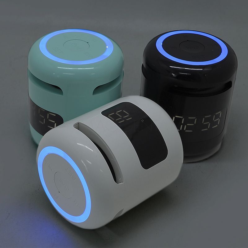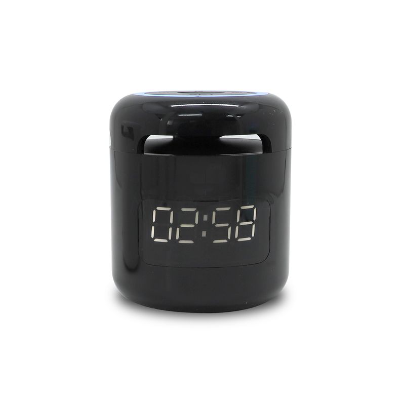 Caixa de som bluetooth com relógio despertador, produzida em plástico e com borrachas antiderrapantes na área inferior, a caixa de som tem bateria de longa duração, display de LED na área frontal, e anel de led brilhante na parte superior. A caixa de som executa nos modos bluetooth, rádio FM, cartão TF-microSD e entrada auxiliar P2. Acompanha cabo USB e manual em inglês e chinês. Imagem ilustrativa.