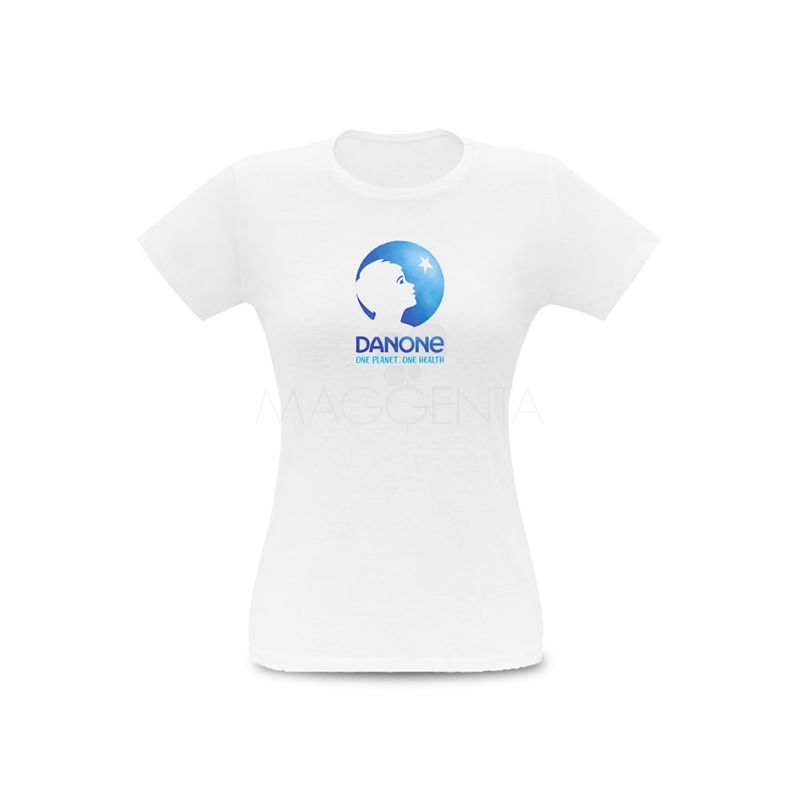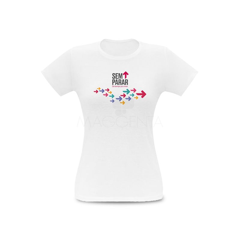 Camiseta feminina produzida em malha jersey 100% algodão (150 g/m²). Peça cortada e cosida com costura dupla nas. Tamanhos: P (A60 x B41cm), M (A62 x B44cm), G (64 x 47cm), GG (A66 x B50cm). Personalização em transfer. Obs: Nos artigos de têxtil podem existir desvios de 5% em relação às medidas indicadas.