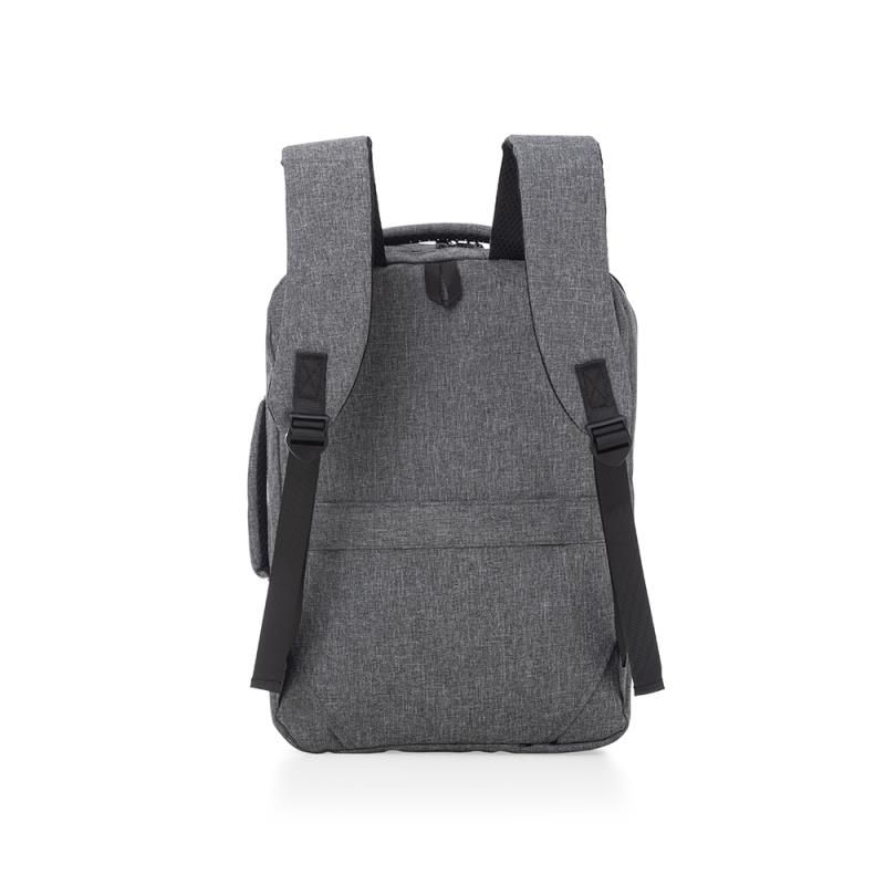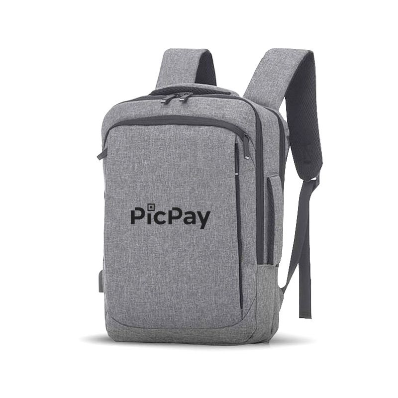 Mochila e Pasta para Notebook personalizada produzida em tecido poliéster. Possui parte externa com conector USB na lateral; 2 Bolsos frontais, alça de mão e ombro acolchoadas. Parte interna com compartimento para notebook de ate 16.5 Polegadas. Ideal para brindes promocionais e eventos corporativos. Imagem ilustrativa.