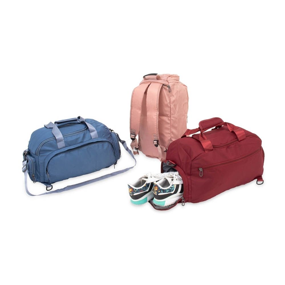 Bolsa esportiva de 28 litros em poliéster resistente à água com cinco compartimentos, sendo três deles exclusivos para tênis, itens molhados e armazenamento das alças de costas.