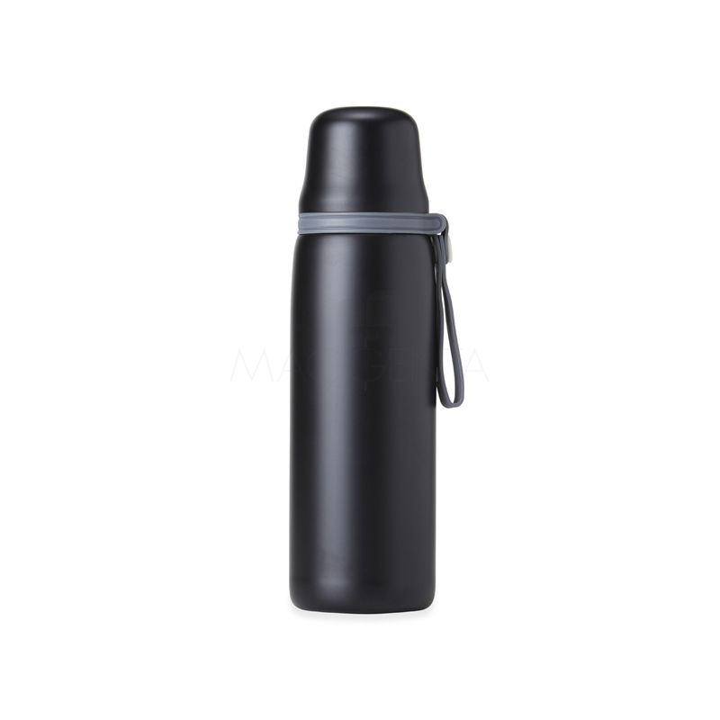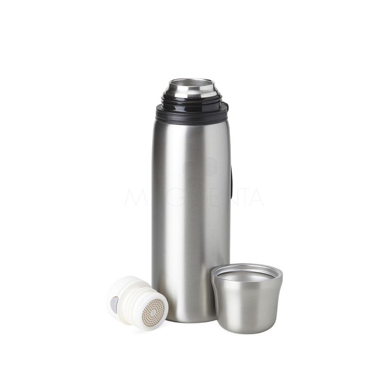 Garrafa térmica feita em inox com parede dupla, capacidade de 850ml. Com alça emborrachada para transporte, a garrafa contém filtro infusor, tampa com botão de acionamento e tampa externa utilizável como copo.
