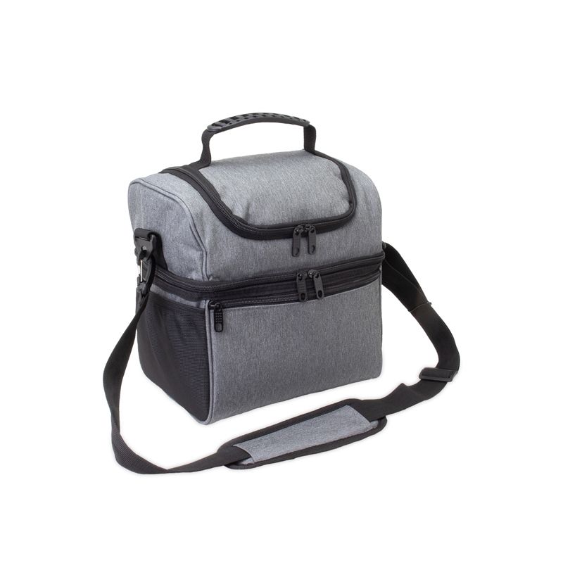 Bolsa térmica dupla de nylon com três compartimentos, capacidade de 12 litros. Contém dois compartimentos térmicos isolados, sendo o principal com costura soldada. A bolsa possui alça de mão com pegador plástico, bolsos laterais em malha e acompanha alça transversal.
