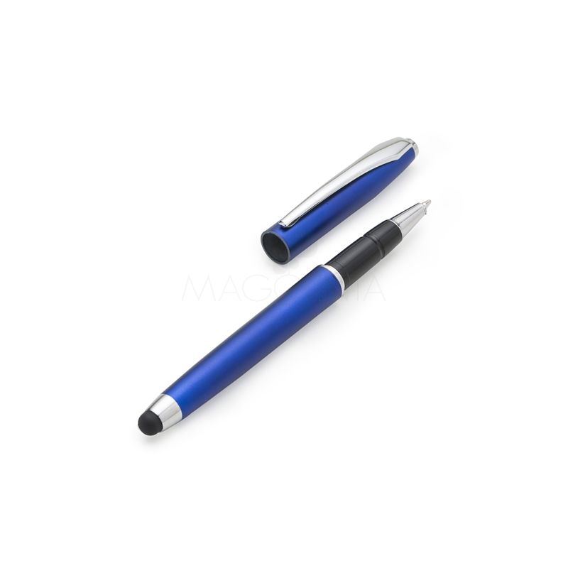 Caneta plástica personalizada com tampa e touch screen, carga esferográfica azul. Ideal para divulgar sua empresa em eventos corporativos, brindes personalizados e campanhas.