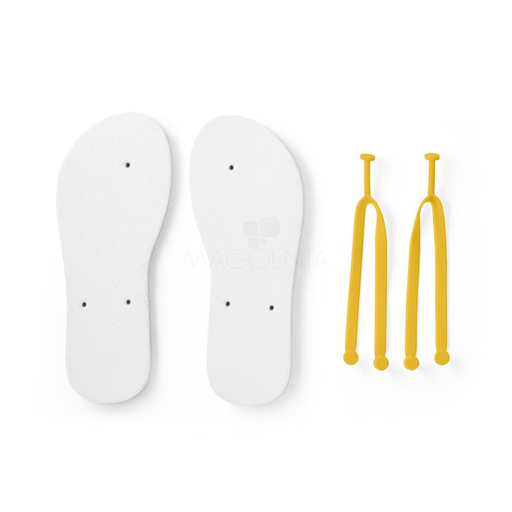 Chinelos confortáveis com sola em EVA e tira em PVC. A sola é totalmente personalizável em sublimação. Tamanhos disponíveis: P/M (36 ao 39). Fornecidos num polybag.