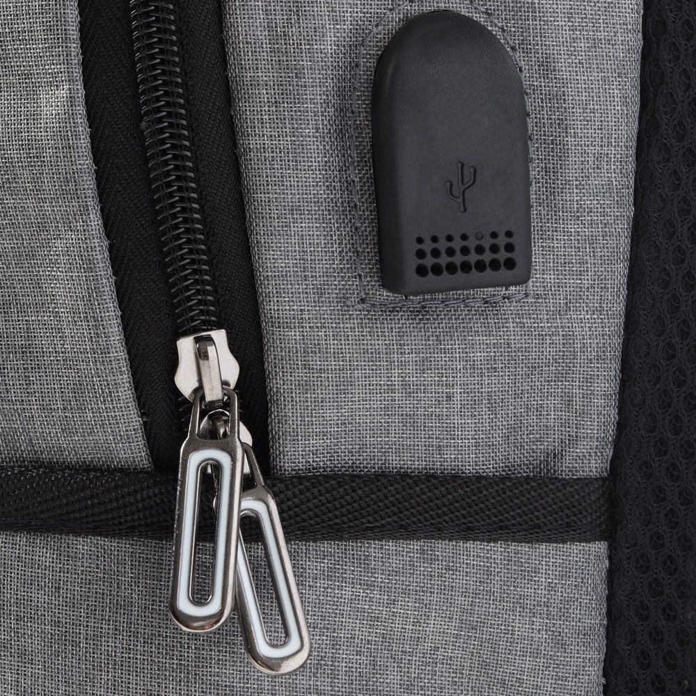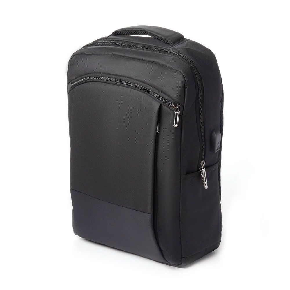 Mochila para notebook em tecido poliéster, sua parte externa contém bolso frontal com zíper, bolso pequeno na lateral direita, conector USB., alça de mão e ombro acolchoada e a parte interna com compartimento acolchoado para notebook até 15.6", porta caneta e porta objeto.