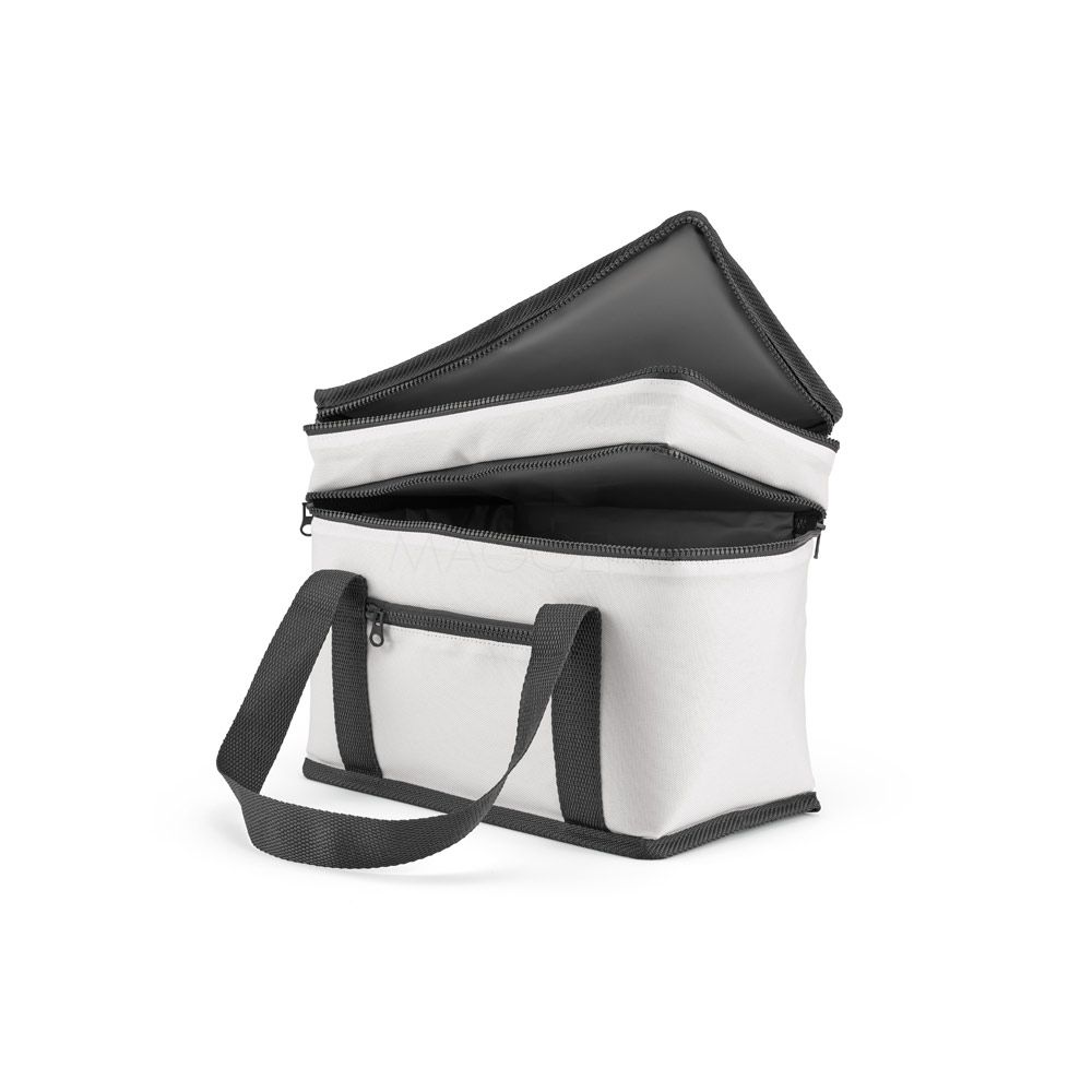 Sacola térmica em 600D poliéster reciclado (100% rPET). Contém 2 compartimentos principais com isolamento em PEVA para facilitar a higienização e um bolso frontal com zíper. Capacidade até 10 L. Certificação EU Food Grade.