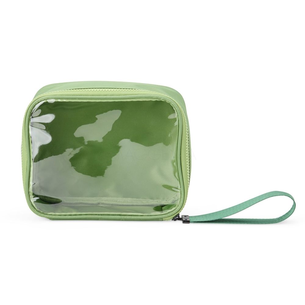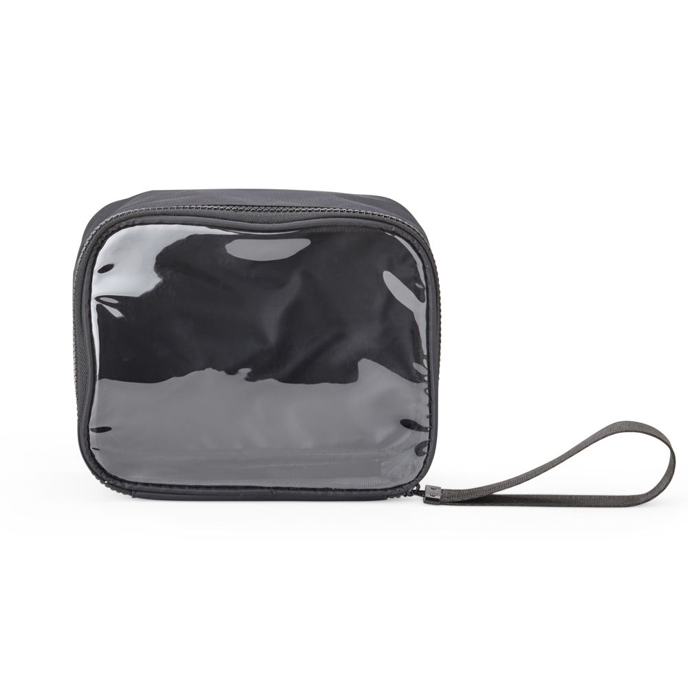 Nécessaire confeccionada em nylon, com frente em visor transparente, fechamento por zíper e alça superior. Inclui também uma alça de transporte em nylon.