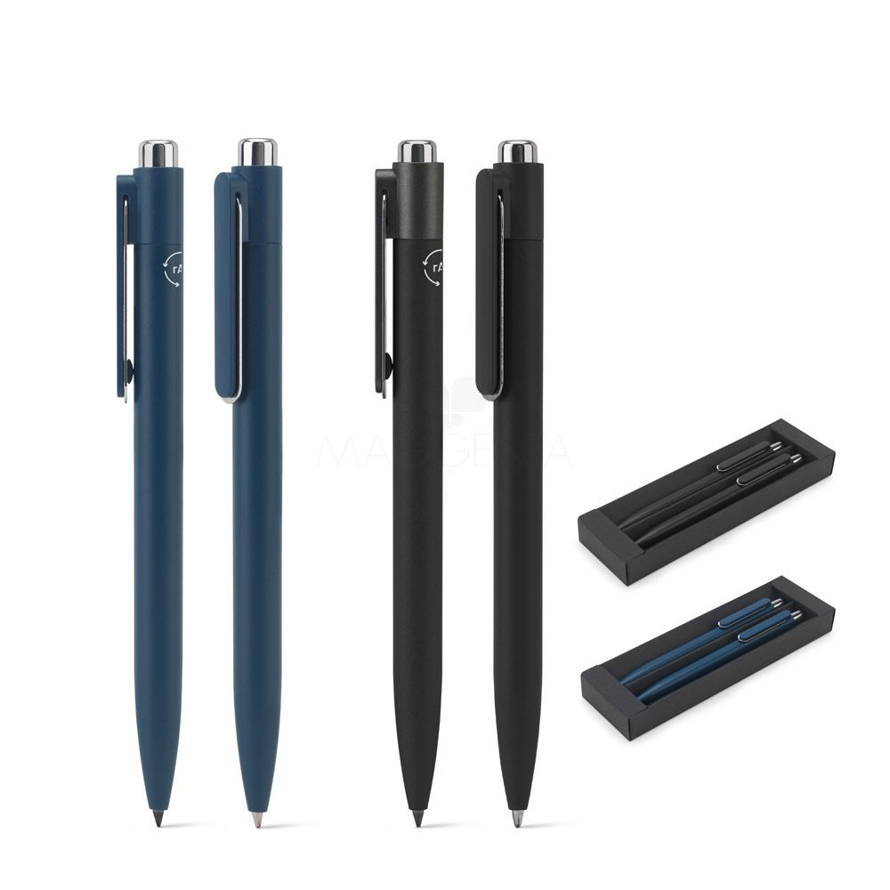 Conjunto composto por uma esferográfica e uma caneta sem tinta, ambas em alumínio 94% reciclado. A esferográfica tem escrita em azul até 1.5 km e a caneta sem tinta permite um uso prolongado sem a necessidade de apontar. Um conjunto que proporciona uma sensação de escrita suave e fluída. Fornecido em caixa presente de papel proveniente de gestão florestal sustentável.
