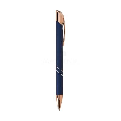 Caneta metálica com detalhes em plástico, acionamento por clique e carga esferográfica azul de 1.0mm, o que proporciona uma pegada leve e uma escrita precisa.