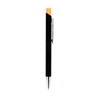 Caneta esferográfica com carga azul de 1.0mm. Possui construção metálica e acionamento por clique em bambu, o que proporciona uma pegada leve e maior precisão durante o uso.