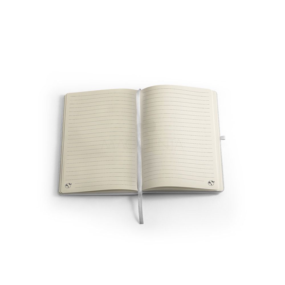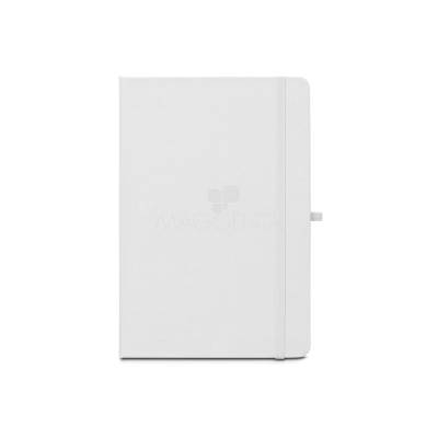 Caderno A5 de capa dura, ideal para personalização em sublimação. O caderno em poliéster 100% reciclado (rPET) 300D tem 160 páginas pautadas em papel 100% reciclado cor de marfim, uma fita separadora, um suporte para esferográfica (não inclusa) e um elástico para fecho do bloco.