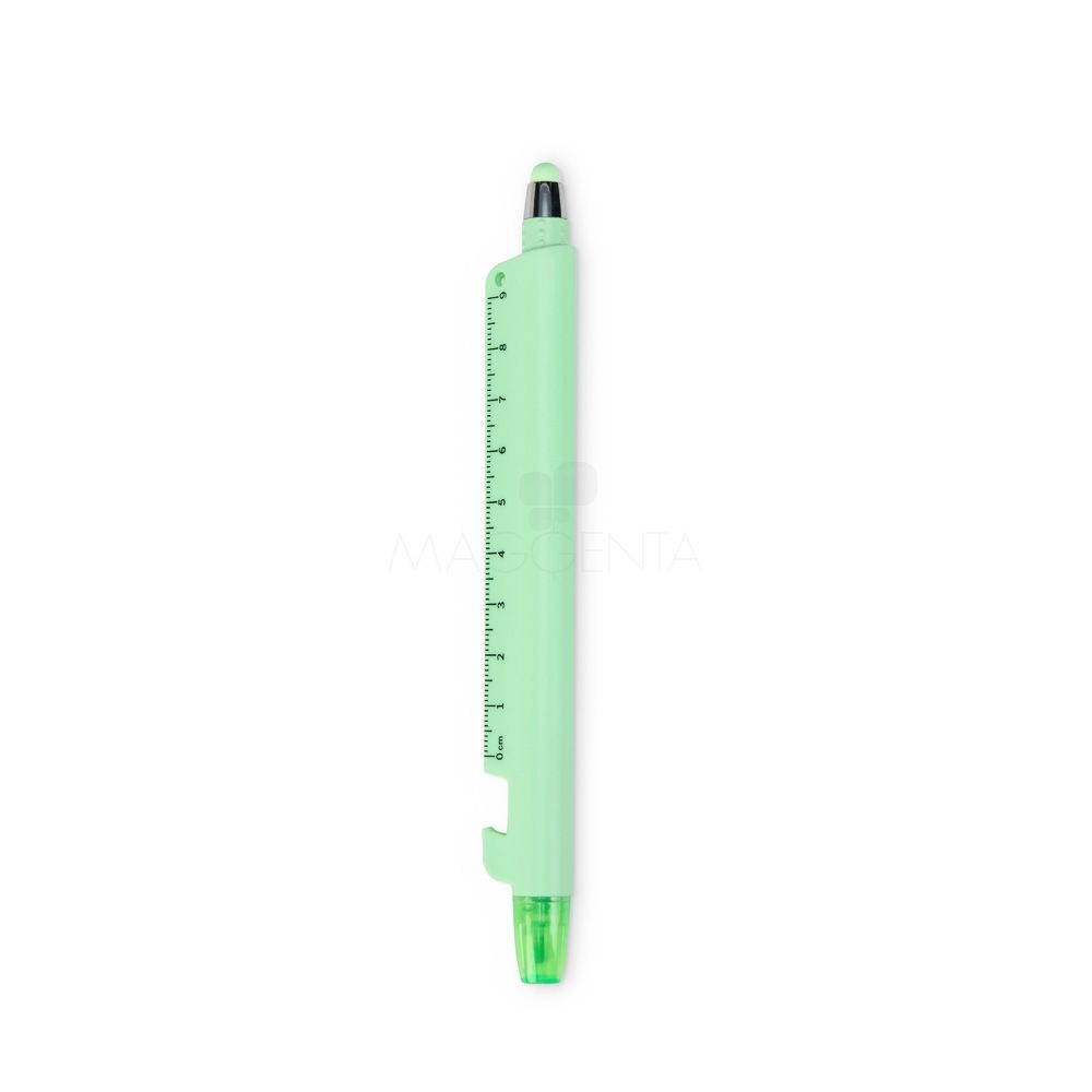 Caneta plástica marca-texto de ponta chanfrada com tampa protetora. Conta com uma régua de 9 centímetros e abridor de garrafas integrados ao corpo da caneta, além de uma caneta menor, destacável da estrutura principal, com ponteira emborrachada para interação com telas sensíveis ao toque e carga esferográfica azul de 1.0mm