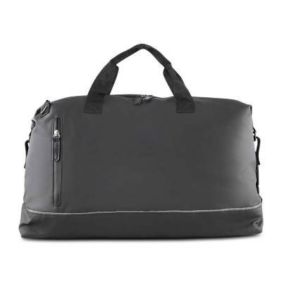 Mala esportiva em PU com revestimento interno em poliéster 210D. Possui faixa refletiva, bolso frontal com zíper, alça de mão e alça de ombro ajustável, além de dois compartimentos internos.