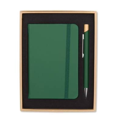 Kit executivo composto por uma caderneta e uma caneta. A caderneta possui capa dura em couro sintético, marca-páginas em fita de cetim e elástico para fechamento, além de aproximadamente 80 folhas com pauta. Por sua vez, a caneta metálica conta com detalhe em bambu, acionamento por clique e carga esferográfica azul de 1,0mm. Acompanha uma caixa de papelão com berço interno em espuma.
