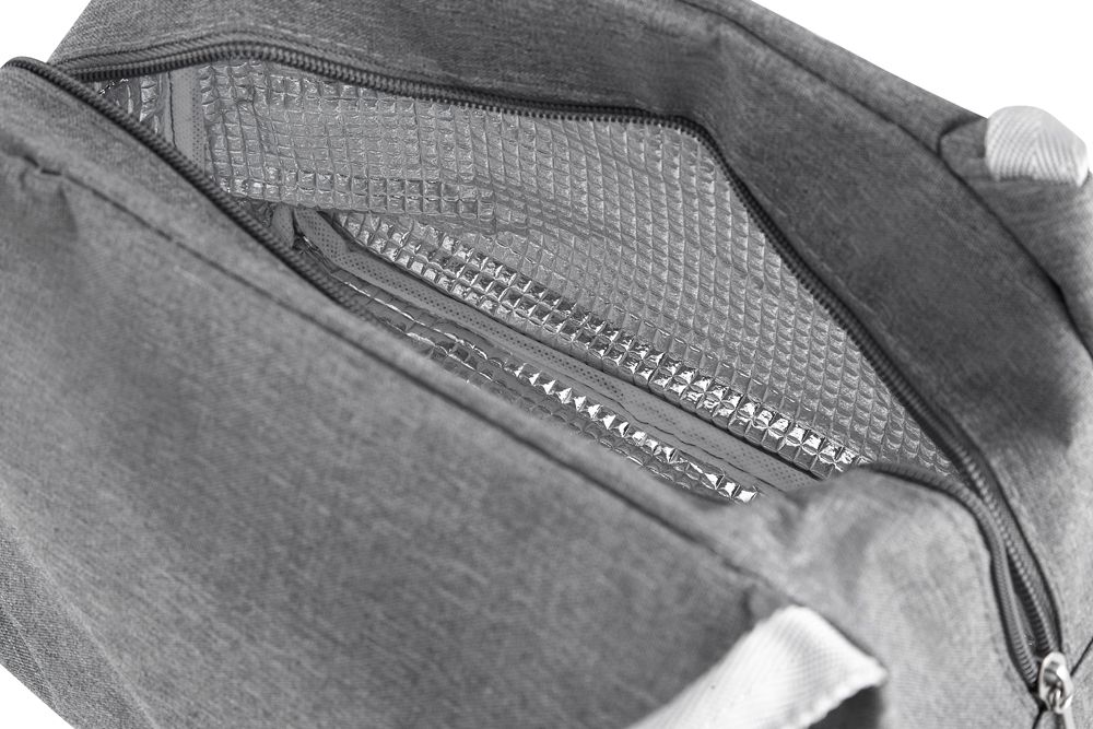 Bolsa térmica costurada, produzida em poliéster 300D na parte externa e alumínio com manta térmica no interior. Modelo sem solda, puxador de zíper em formato de colher, com capacidade para 7 litros.