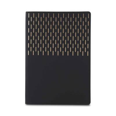 Conjunto composto por caderno com capa em PU com detalhe de gravação dourada, contendo 80 folhas pautadas em papel 70g/m², possui caneta modelo twist em alumínio reciclado na cor do caderno, com acabamento em detalhe rosê, possui estojo em papelão na cor preta.